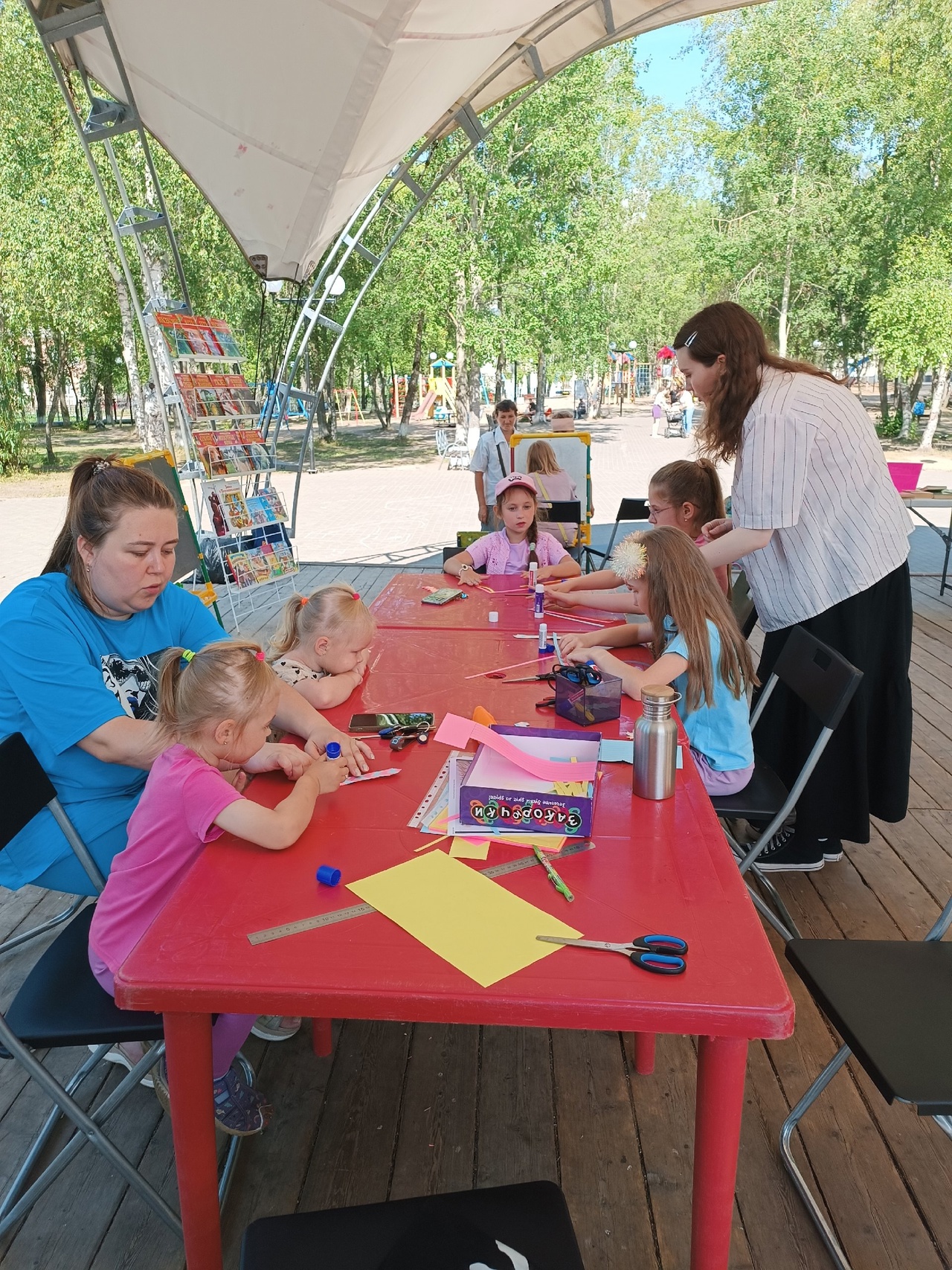 В летнем читальном зале посетителей ждали не только красочные детские издания, увлекательные журналы и разнообразные настольные игры, но и творческие пространства, где каждый желающий мог проявить свои художественные таланты с помощью мела, красок или цветных карандашей. Кроме того, в рамках «Библиотечного дворика» продолжает действовать акция «Читатель дарит читателю»: посетители библиотеки могут взять с выставки понравившуюся книгу и забрать ее домой.