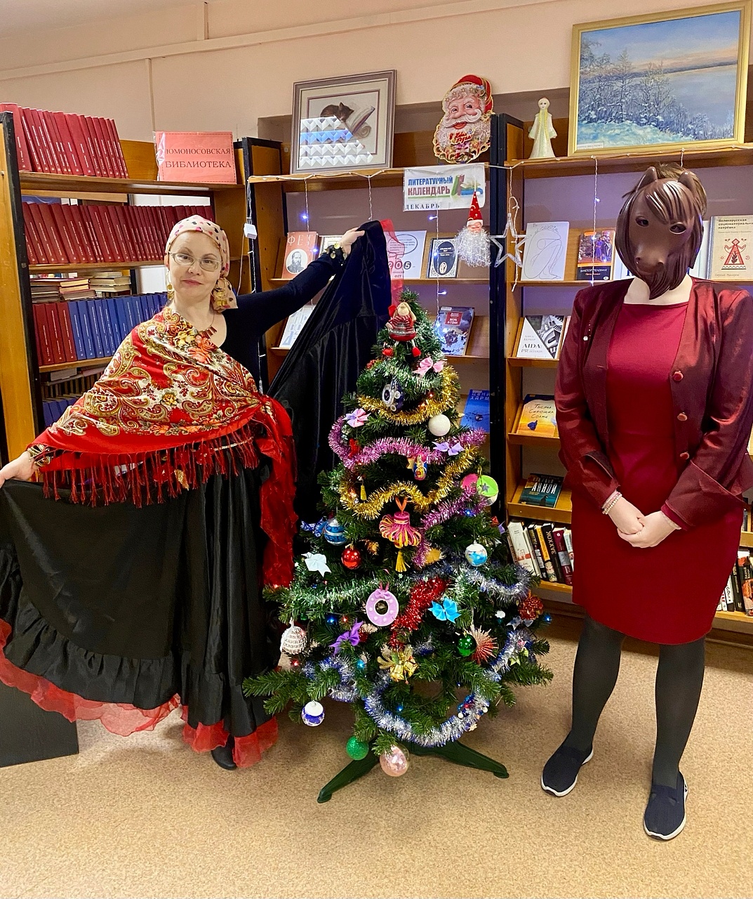 В преддверии Нового года, 29 декабря, посетителей Городской библиотеки ждал неожиданный сюрприз: в зале обслуживания читателей появились… цыганка и Красная Огненная Лошадь — символ наступающего 2026 года! Сотрудники библиотеки Анна Трубкина и Елена Голенищева перевоплотились в этот по-новогоднему символичный дуэт, чтобы подарить гостям праздничное настроение и немного чуда. Вместе они устроили весёлую новогоднюю викторину, полную каверзных и любопытных вопросов о лошадях: от поэзии и поговорок до удивительных фактов из мира природы. Читатели с удовольствием отгадывали, какой конь «врёт» лучше всех, кому «в зубы не смотрят» и кто же сказал знаменитую фразу: «Все мы немножко лошади, каждый из нас по-своему лошадь». Каждый ответ сопровождался улыбками, восклицаниями и искренним интересом — ведь даже в самых знакомых строках можно открыть что-то новое!