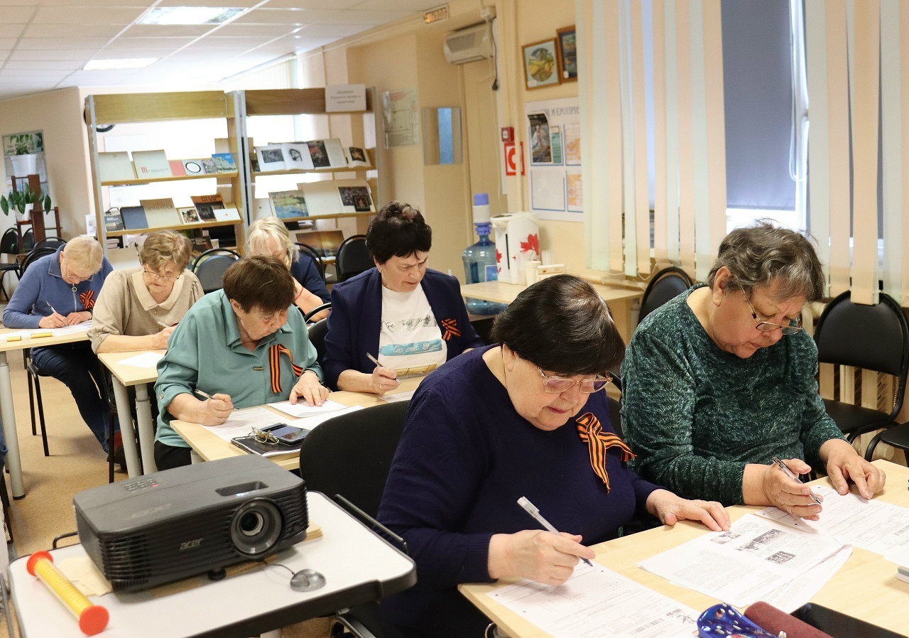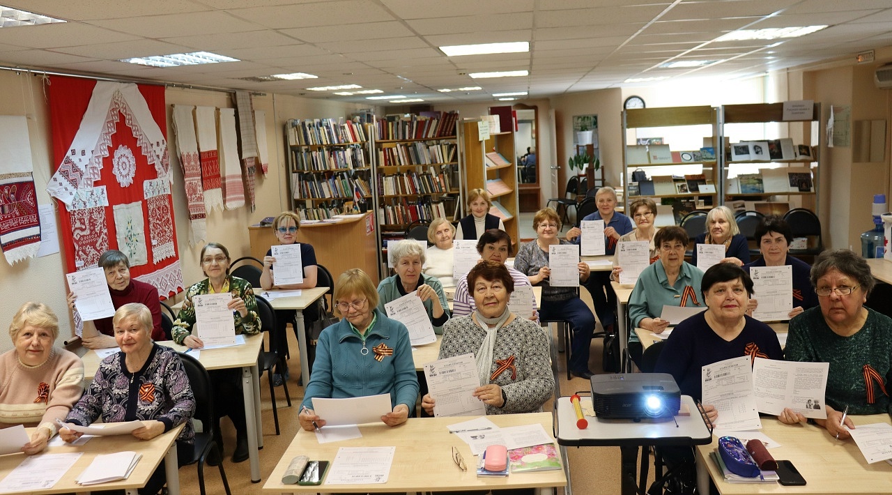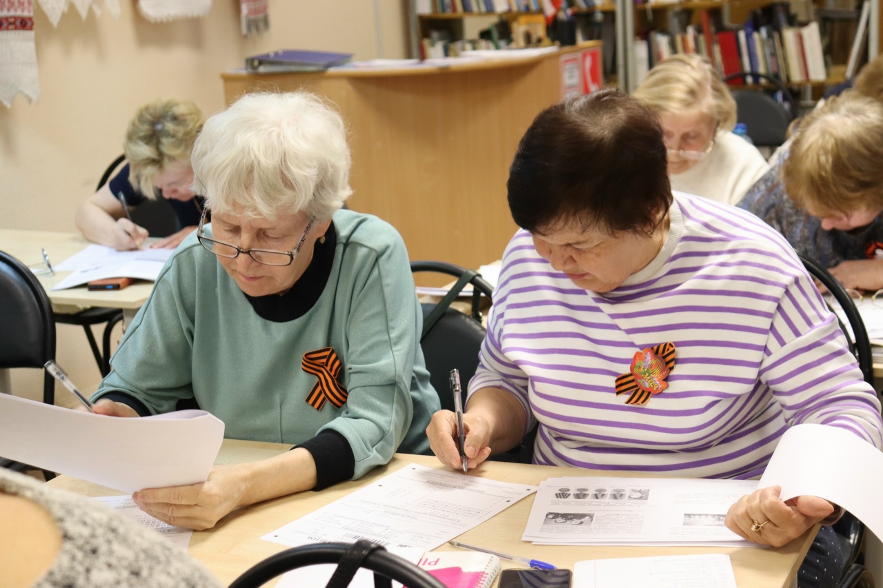 В читальном зале городской центральной библиотеки особую подготовку к акции прошли участники Студии «Старость в радость». Полтора месяца они активно участвовали в специальном цикле историко‑просветительских мероприятий. В библиотеке прошли «Часы истории», посвященные Победе в Великой Отечественной войне, которые помогли вспомнить страницы героического и трагического прошлого нашей страны и подготовиться к участию в Международной патриотической акции «Диктант Победы». Завершили этот цикл два часа истории, которые состоялись 20 и 22 апреля. 20 апреля речь шла о третьем этапе войны, о Победе и об окончании Второй мировой войны. 22 апреля участники поговорили о кинофронте: в кратчайшие сроки эвакуированные киностудии — в первую очередь Московская и Ленинградская — наладили выпуск киносборников, короткометражек, а позже и полнометражных игровых фильмов. Участники вспоминали подвиг фронтовых кинооператоров, и огромную роль в сохранении исторической памяти сотен километров отснятой кинохроники. Спасибо всем, кто был на мероприятиях и показал уважение к истории Родины!